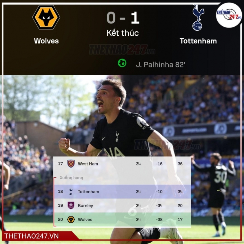 (Kết quả bóng đá) - Tottenham giành chiến thắng nghẹt thở 1-0 trước Wolves ở vòng 34 Premier League, nhưng vẫn giậm chân ở vị trí thứ 18 khi West Ham thắng trận, khiến cuộc đua trụ hạng thêm căng thẳng.
