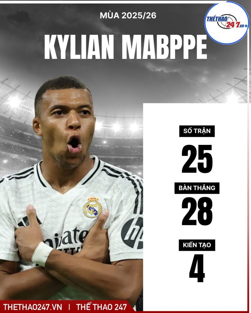 Tuy nhiên, điều thực sự khiến truyền thông dậy sóng lại là quyết định của HLV Xabi Alonso khi để Kylian Mbappe thi đấu trọn vẹn 90 phút. Sau quãng thời gian khởi đầu không mấy suôn sẻ tại Santiago Bernabeu, chân sút người Pháp giờ đã thực sự trở thành siêu sao số một của đội bóng Hoàng gia, điều được minh chứng bằng 28 bàn thắng sau 23 lần ra sân ở mùa giải này. Với tổng cộng 58 pha lập công trong năm 2025, Mbappe đang đứng trước cơ hội phá kỷ lục ghi bàn trong một năm dương lịch của Cristiano Ronaldo cho CLB lịch sử này, khi Real Madrid tiếp đón Sevilla tại La Liga vào cuối tuần này, cũng là trận đấu cuối cùng của đội trong tháng 12.