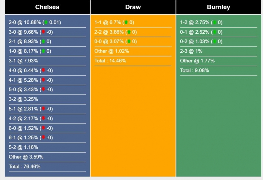 Tỷ số khả dĩ nhất để Chelsea thắng là 2-0 với xác suất 10,88%. Tỷ số có khả năng xảy ra tiếp theo cho kết quả đó là 3-0 (9,66%) và 2-1 (8,93%). Tỷ số hòa có khả năng xảy ra cao nhất là 1-1 (6,7%), trong khi tỷ số mà Burnley thắng là 1-2 (2,75%).
