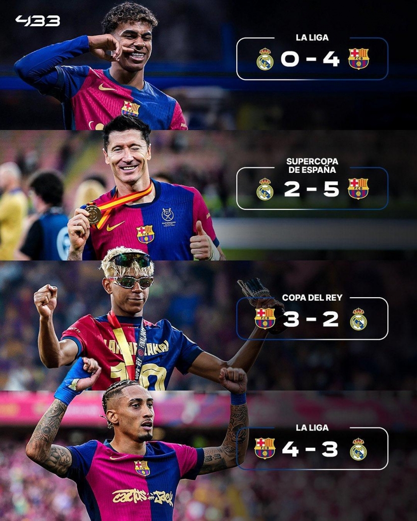 Trong khi đó, Barcelona bước vào trận đấu này với tinh thần hưng phấn sau chiến thắng hủy diệt 6-1 trước Olympiacos chỉ còn 10 người. Marcus Rashford tỏa sáng với cú đúp, Lamine Yamal ghi bàn trên chấm phạt đền, còn Fermín López lập hat-trick, giúp Blaugrana duy trì đà thăng hoa trước thềm trận Siêu kinh điển. Mùa trước, Barcelona toàn thắng cả 4 lần đối đầu Real và sẽ quyết tâm kéo dài chuỗi ấn tượng ấy tại Bernabéu.