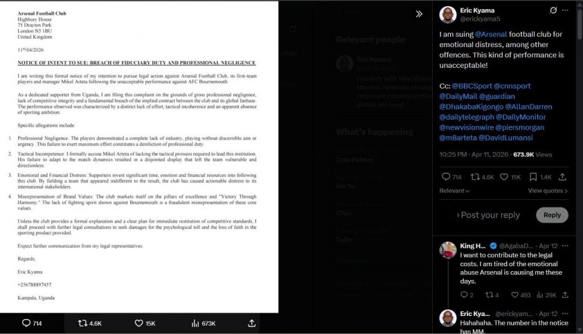 Làn sóng phẫn nộ trong cộng đồng người hâm mộ Arsenal đang dâng cao sau thất bại 1-2 ngay trên sân nhà trước Bournemouth. Đáng chú ý, một cổ động viên tại Uganda đã gây sốc khi quyết định đâm đơn kiện chính đội bóng mà mình yêu mến.