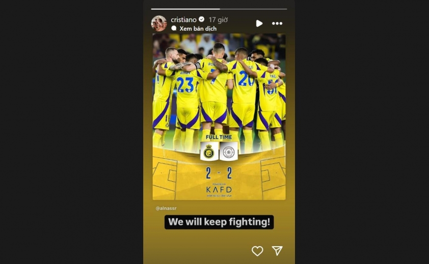 Dù kết quả không như mong đợi, Ronaldo vẫn thể hiện tinh thần chiến đấu không mệt mỏi. Trên trang Instagram cá nhân, anh chia sẻ một bức ảnh các đồng đội đang quây quần bên nhau, kèm theo dòng chú thích: "Chúng tôi sẽ tiếp tục chiến đấu!" Thông điệp này phản ánh sự quyết tâm của Ronaldo trong việc giữ vững niềm tin và hy vọng vào tương lai.