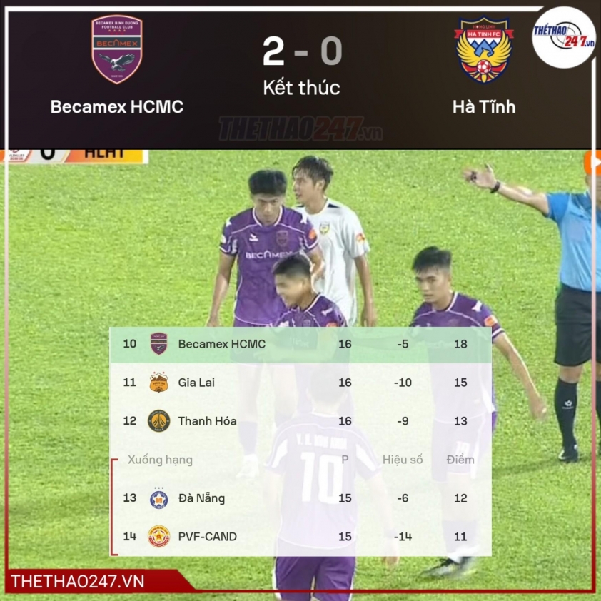 Becamex TP.HCM giành chiến thắng thuyết phục 2-0 trước Hà Tĩnh sau hiệp hai bùng nổ, qua đó nâng tổng điểm lên 18 và tạo khoảng cách an toàn hơn với nhóm xuống hạng.