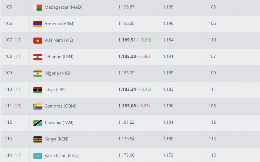 Đáng chú ý, đội tuyển Việt Nam hiện chỉ còn cách top 100 FIFA đúng 7 bậc - cột mốc từng được xem là “trần thành tích” của bóng đá Việt Nam trong nhiều năm. Việc áp sát nhóm 100 đội mạnh nhất thế giới không chỉ mang ý nghĩa về thứ hạng, mà còn phản ánh sự ổn định trong lực lượng, phong độ và cách tích lũy điểm số bền vững, thay vì những cú bứt phá ngắn hạn.