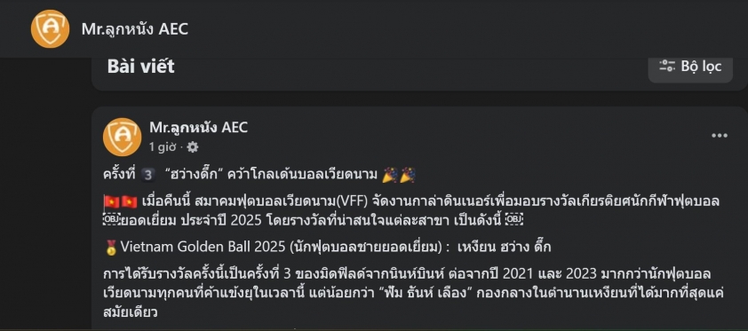 Nguyên văn đoạn chia sẻ bằng tiếng Thái Lan của MrFootballAEC có nội dung như sau: “Lần thứ 3 Hoàng Đức giành Quả bóng vàng Việt Nam. Tối qua, Liên đoàn Bóng đá Việt Nam (VFF) đã tổ chức Gala Dinner để trao các giải thưởng tôn vinh những cầu thủ xuất sắc nhất năm 2025. Quả bóng vàng Việt Nam 2025 (Cầu thủ nam xuất sắc nhất): Nguyễn Hoàng Đức. Đây là lần thứ ba tiền vệ của Ninh Bình giành danh hiệu này, sau các năm 2021 và 2023, nhiều hơn bất kỳ cầu thủ Việt Nam nào còn đang thi đấu hiện nay, nhưng vẫn ít hơn huyền thoại Phạm Thành Lương - người đang giữ kỷ lục cao nhất.”