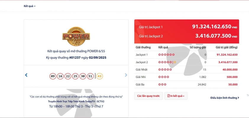 Vietlott 2/9/2025 - Kết quả xổ số Vietlott Power 6/55 ngày 2/9/2025