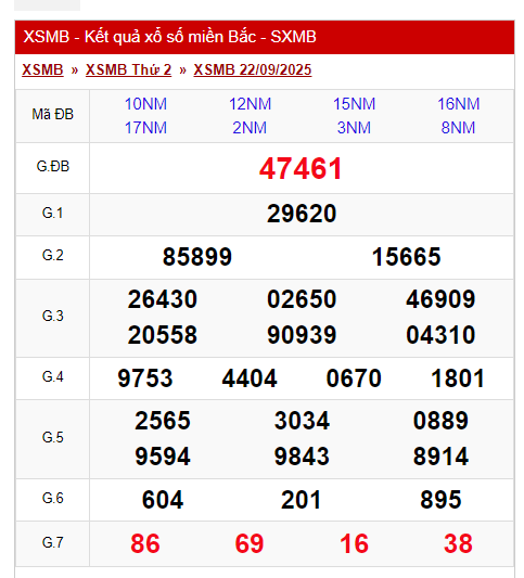 Kết quả xổ số miền Bắc (XSMB) ngày 22/9