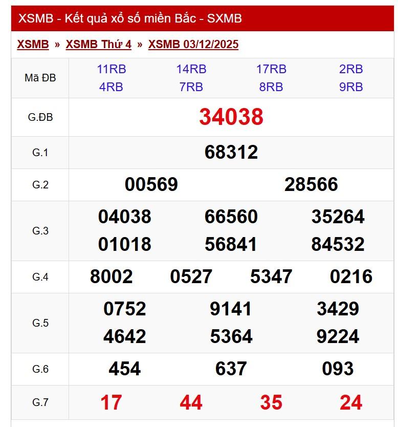 Kết quả xổ số miền Bắc (XSMB) hôm nay ngày 3/12