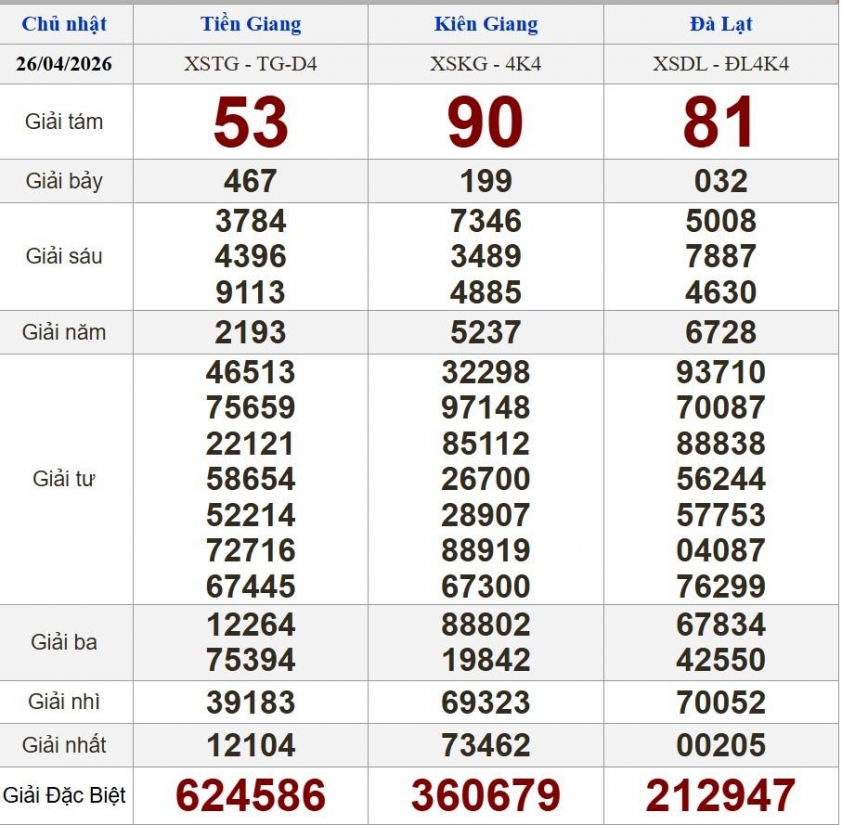 XSMN 26/4/2026 - Kết quả xổ số Tiền Giang - Kiên Giang - Đà Lạt hôm nay 26/4/2026
