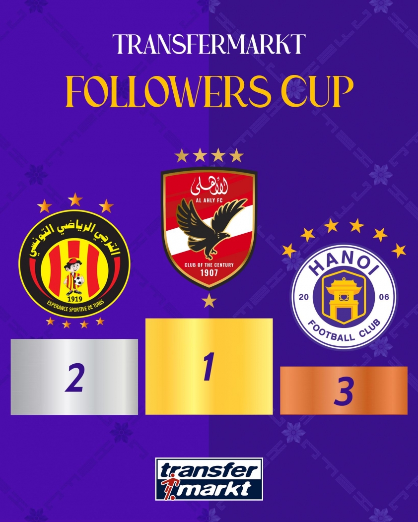 Trên trang chủ, CLB Hà Nội vừa thông báo đoạt hạng 3 ở cuộc thi "Transfermarkt Followers Cup 2025". Dẫn đầu cuộc thi là CLB Al Ahly FC (Ai Cập) còn vị trí thứ hai thuộc về Esperance Tunis của Tunisia.