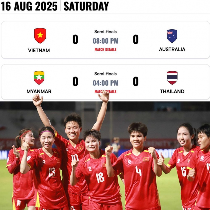 Hai cặp đấu bán kết tại giải VĐ bóng đá nữ Đông Nam Á 2025 đã được xác định là cuộc đối đầu giữa các đội Việt Nam vs Úc; Thái Lan vs Myanmar. Cả hai trận đấu này đều sẽ diễn ra trong cùng ngày 16/8 trên sân Lạch Tray (Hải Phòng).