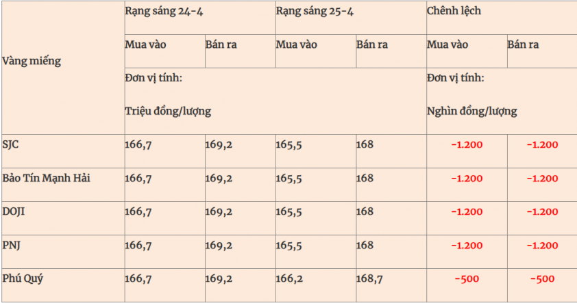 Cụ thể, vàng SJC được niêm yết quanh mức 165,5 triệu đồng/lượng (mua vào) và 168 triệu đồng/lượng (bán ra), giảm tới 1,2 triệu đồng/lượng ở cả hai chiều so với sáng 24/4.
