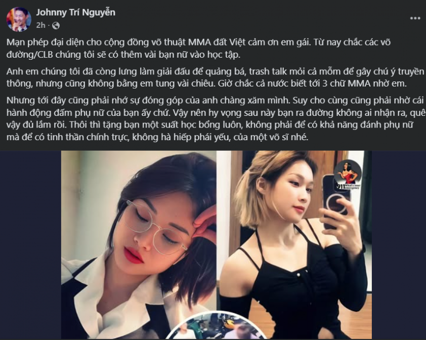 Thôi thì tặng bạn một suất học bổng luôn, không phải để có khả năng đánh phụ nữ mà để có tinh thần chính trực, không hà hiếp phái yếu, của một võ sĩ nhé", Johny Trí Nguyễn nhận được lượt tương tác lớn với bài viết này.