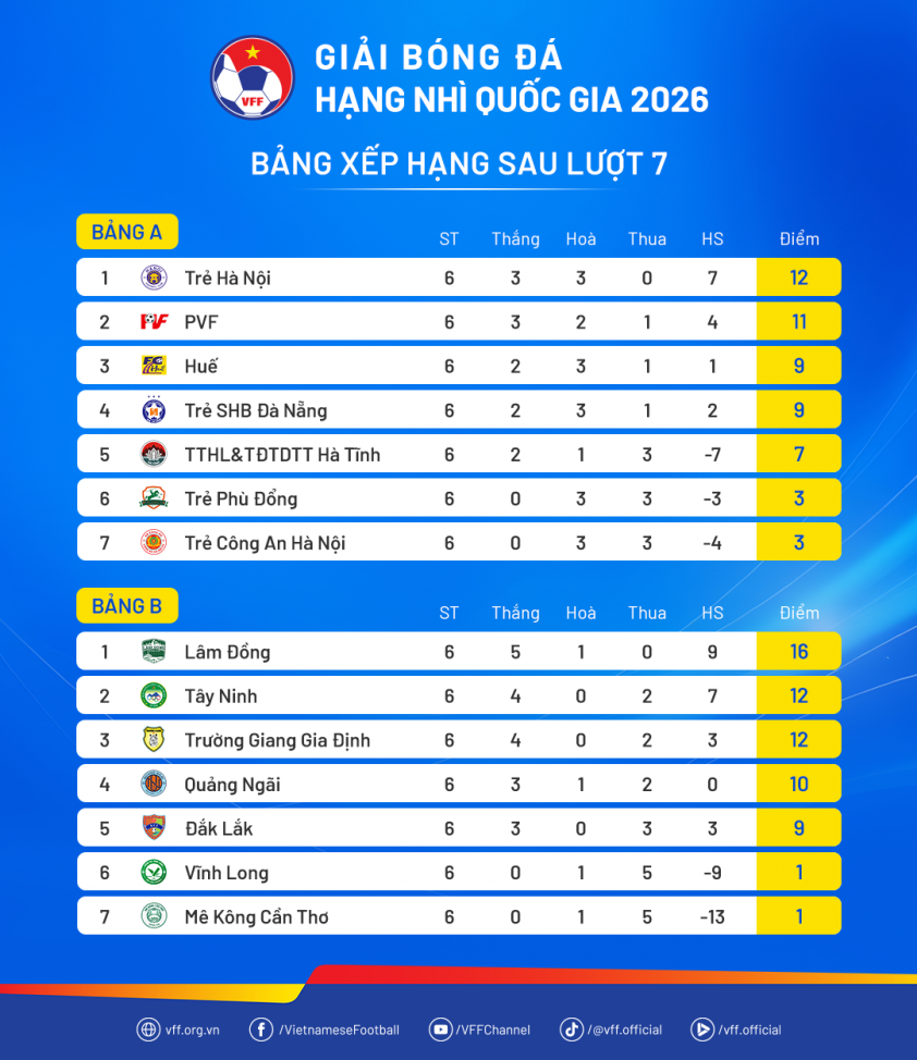 Chiều 25/4, lượt đi Giải bóng đá hạng Nhì quốc gia 2026 đã chính thức khép lại sau các trận đấu thuộc vòng 7 tại hai bảng A và B, qua đó bước đầu phác họa cục diện cuộc đua thăng hạng cũng như trụ hạng ở mùa giải năm nay.