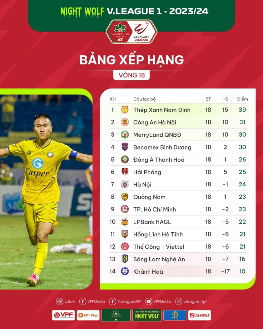 Vòng 18 V-League 2023/24 kết thúc với những kết quả không quá bất ngờ, cuộc đua vô địch cũng như trụ hạng cũng đang dần sáng tỏ.