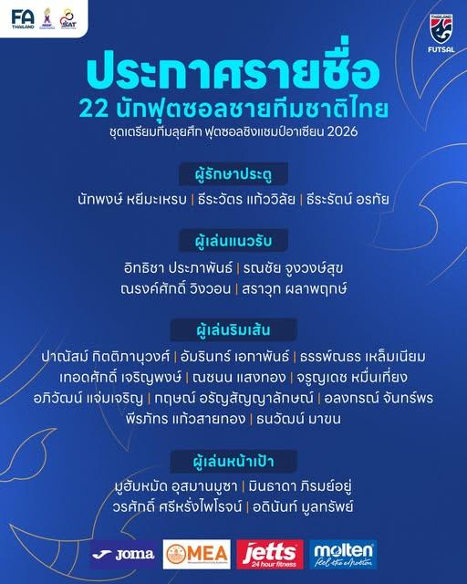 Liên đoàn Bóng đá Thái Lan đã công bố danh sách 22 cầu thủ được triệu tập vào đội tuyển futsal quốc gia chuẩn bị cho Giải VĐ Đông Nam Á 2026.