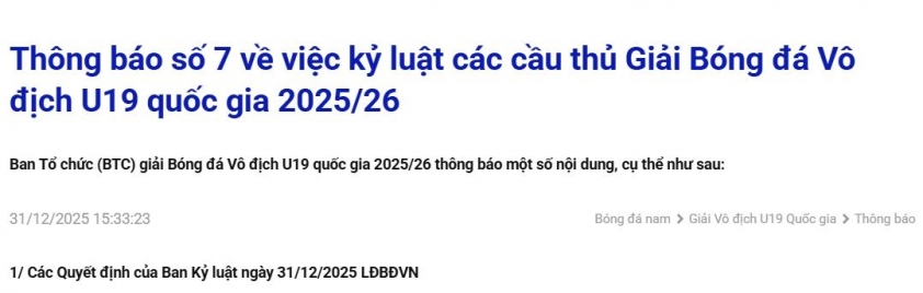 Ban Tổ chức mới đây ra thông báo số 7 về việc kỷ luật các cầu thủ Giải Bóng đá Vô địch U19 quốc gia 2025/26.