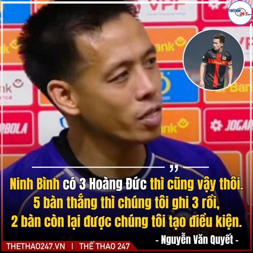 "Có 3 Hoàng Đức thì cũng vậy thôi", Văn Quyết khẳng định vắng Hoàng Đức không phải nguyên nhân khiến CLB Ninh Bình bại trận. "Tôi nghĩ, thứ bóng đá mà trung vệ có bóng lại treo lên cho tiền đạo, thì đó không phải là bóng đá. Tôi không thể đánh giá hết về CLB Ninh Bình, nhưng tôi có thể nói CLB Hà Nội đã làm tốt. Tất cả những gì đội làm được thời gian qua, 2 chiến thắng sân nhà, 1 chiến thắng sân khách. Đó là điều tuyệt vời tôi đã mang đến cho khán giả".