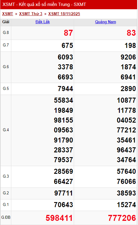 Kết quả xổ số miền Trung (XSMT) hôm nay ngày 18/11