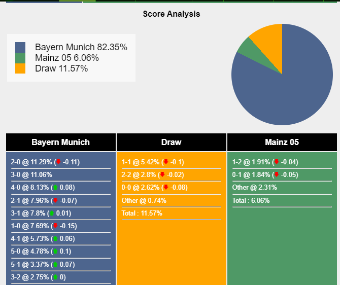 Tỷ số khả dĩ nhất để Bayern Munich thắng là 2-0 với xác suất 11,29%. Tỷ số có khả năng xảy ra tiếp theo cho kết quả đó là 3-0 (11,06%) và 4-0 (8,13%). Tỉ số hòa có khả năng xảy ra cao nhất là 1-1 (5,42%), trong khi Mainz 05 thắng là 1-2 (1,91%).