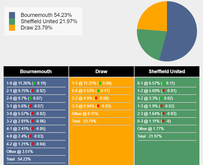 Tỷ số khả dĩ nhất để Bournemouth thắng là 1-0 với xác suất 11,26%. Tỷ số có khả năng xảy ra tiếp theo cho kết quả đó là 2-1 (9,75%) và 2-0 (9,7%). Tỉ số hòa có khả năng xảy ra cao nhất là 1-1 (11,31%), trong khi Sheffield United thắng là 0-1 (6,57%).