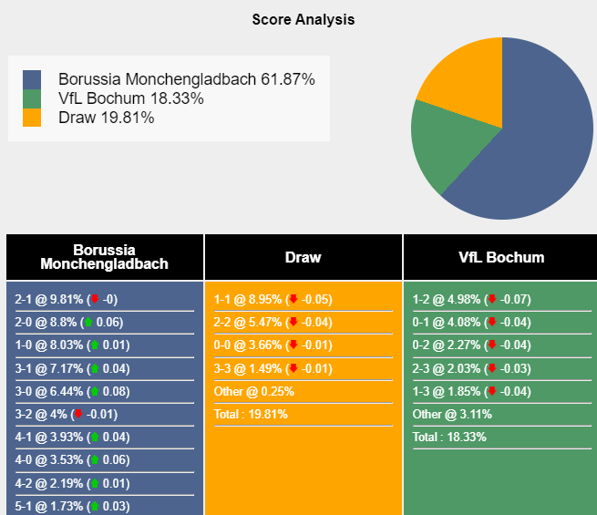 Tỉ số có khả năng xảy ra nhất để Borussia Monchengladbach thắng là 2-1 với xác suất 9,81%. Tỷ số có khả năng xảy ra tiếp theo cho kết quả đó là 2-0 (8,8%) và 1-0 (8,03%). Tỷ số hòa có khả năng xảy ra cao nhất là 1-1 (8,95%), trong khi tỷ số mà VfL Bochum thắng là 1-2 (4,98%).