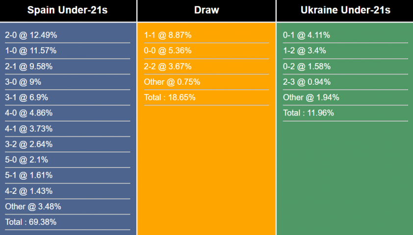 Tỷ số có khả năng nhất cho một trận thắng của U21 Tây Ban Nha là 2-0 với xác suất là 12,49%. Các tỷ số có khả năng xảy ra tiếp theo cho kết quả đó là 1-0 (11,57%) và 2-1 (9,58%). Tỷ số hòa dễ xảy ra nhất là 1-1 (8,87%), trong khi tỷ số trận thắng của U21 Ukraine là 0-1 (4,11%).