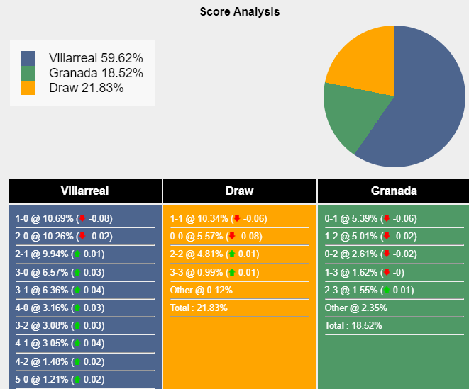 Tỉ số khả dĩ nhất để Villarreal thắng là 1-0 với xác suất 10,69%. Tỷ số có khả năng xảy ra tiếp theo cho kết quả đó là 2-0 (10,26%) và 2-1 (9,94%). Tỷ số hòa có khả năng xảy ra cao nhất là 1-1 (10,34%), trong khi tỷ số cho Granada thắng là 0-1 (5,39%).