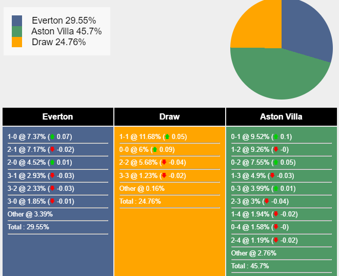 Tỉ số khả dĩ nhất để Aston Villa thắng là 0-1 với xác suất 9,52%. Tỷ số có khả năng xảy ra tiếp theo cho kết quả đó là 1-2 (9,26%) và 0-2 (7,55%). Tỷ số có khả năng thắng Everton cao nhất là 1-0 (7,37%) , trong khi tỷ số hòa là 1-1 (11,68%).