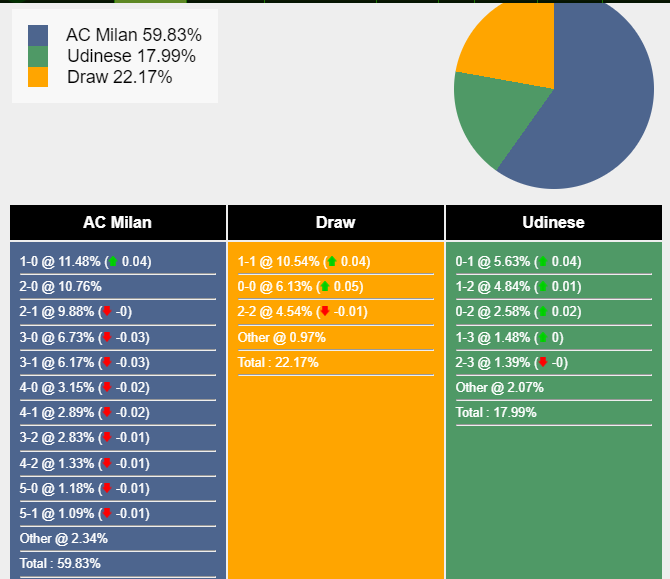 Tỉ số khả dĩ nhất để AC Milan thắng là 1-0 với xác suất 11,48%. Tỷ số có khả năng xảy ra tiếp theo cho kết quả đó là 2-0 (10,76%) và 2-1 (9,88%). Tỉ số hòa có khả năng xảy ra cao nhất là 1-1 (10,54%), trong khi Udinese thắng là 0-1 (5,63%).