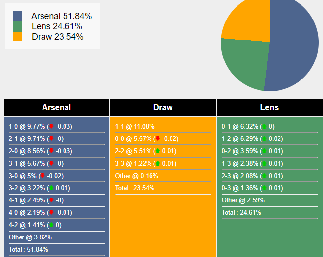 Tỉ số khả dĩ nhất để Arsenal thắng là 1-0 với xác suất 9,77%. Tỷ số có khả năng xảy ra tiếp theo cho kết quả đó là 2-1 (9,71%) và 2-0 (8,56%). Khả năng thắng Lens cao nhất là 0-1 (6,32%), trong khi tỷ số hòa là 1-1 (11,08%).