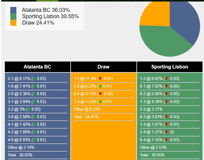 Tỉ số có khả năng xảy ra nhất để Sporting Lisbon giành chiến thắng là 1-2 với xác suất 8,62%. Tỷ số có khả năng xảy ra tiếp theo cho kết quả đó là 0-1 (7,82%) và 0-2 (5,96%). Tỷ số có khả năng thắng Atalanta BC cao nhất là 2-1 (8,17%), trong khi tỷ số hòa là 1-1 (11,3%).