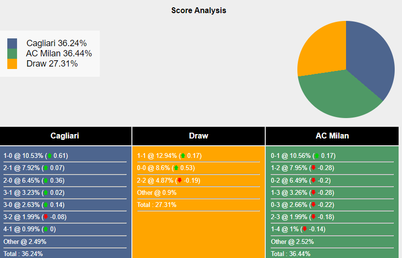 Tỷ số khả dĩ nhất cho chiến thắng của AC Milan là 0-1 với xác suất 10,56%. Tỷ số có khả năng xảy ra tiếp theo cho kết quả đó là 1-2 (7,95%) và 0-2 (6,49%). Tỷ số có khả năng thắng Cagliari cao nhất là 1-0 (10,53%) , trong khi tỷ số hòa là 1-1 (12,94%).