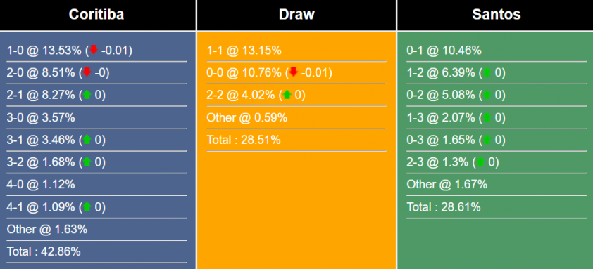 Tỷ số có khả năng nhất cho chiến thắng của Coritiba là 1-0 với xác suất là 13,53%. Các tỷ số có khả năng xảy ra tiếp theo cho kết quả đó là 2-0 (8,51%) và 2-1 (8,27%). Tỷ số dễ thắng nhất của Santos là 0-1 (10,46%), trong khi tỷ số hòa là 1-1 (13,15%).