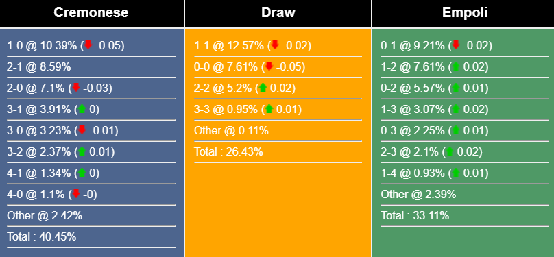 Tỷ số có khả năng nhất cho một chiến thắng của Cremonese là 1-0 với xác suất là 10,39%. Các tỷ số có khả năng xảy ra tiếp theo cho kết quả đó là 2-1 (8,59%) và 2-0 (7,1%). Tỷ số dễ thắng nhất của Empoli là 0-1 (9,21%), trong khi tỷ số hòa là 1-1 (12,57%).