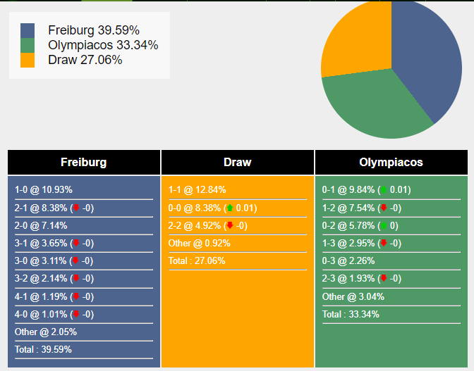 Tỉ số khả dĩ nhất để Freiburg thắng là 1-0 với xác suất 10,93%. Tỷ số có khả năng xảy ra tiếp theo cho kết quả đó là 2-1 (8,38%) và 2-0 (7,14%). Khả năng thắng Olympiacos cao nhất là 0-1 (9,84%), trong khi tỷ số hòa là 1-1 (12,84%).