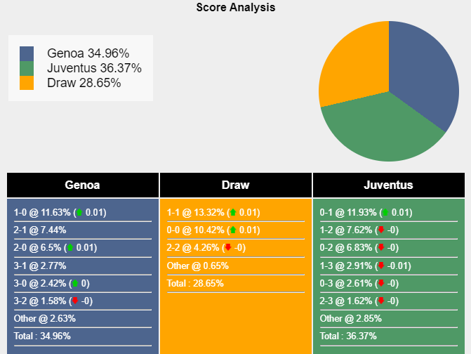 Tỷ số khả dĩ nhất cho chiến thắng của Juventus là 0-1 với xác suất 11,93%. Tỷ số có khả năng xảy ra tiếp theo cho kết quả đó là 1-2 (7,62%) và 0-2 (6,83%). Tỷ số có khả năng thắng Genoa cao nhất là 1-0 (11,63%), trong khi tỷ số hòa là 1-1 (13,32%).