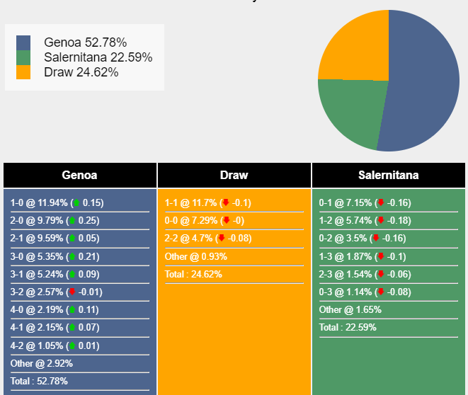 Tỉ số có khả năng xảy ra nhất để Genoa thắng là 1-0 với xác suất 11,94%. Tỷ số có khả năng xảy ra tiếp theo cho kết quả đó là 2-0 (9,79%) và 2-1 (9,59%). Tỷ số hòa có khả năng xảy ra cao nhất là 1-1 (11,7%), trong khi tỷ số cho Salernitana thắng là 0-1 (7,15%).