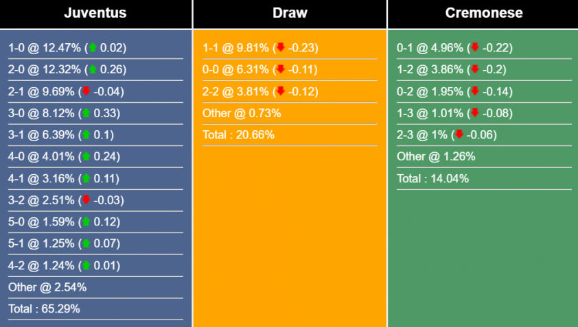 Tỷ số có khả năng nhất cho chiến thắng của Juventus là 1-0 với xác suất là 12,47%. Các tỷ số có khả năng xảy ra tiếp theo cho kết quả đó là 2-0 (12,32%) và 2-1 (9,69%). Tỷ số hòa thích hợp nhất là 1-1 (9,81%), trong khi tỷ số thắng của Cremonese là 0-1 (4,96%).