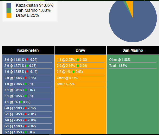 Tỉ số khả dĩ nhất để Kazakhstan thắng là 3-0 với xác suất 14,61%. Tỷ số có khả năng xảy ra tiếp theo cho kết quả đó là 2-0 (12,71%) và 4-0 (12,58%). Tỷ số hòa có khả năng xảy ra cao nhất là 1-1 (2,93%), trong khi đối với San Marino thắng là 0-1 (0,85%).