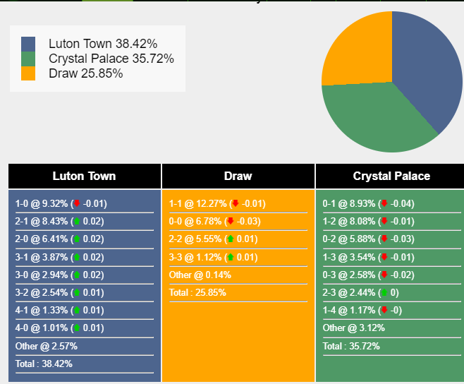 Tỉ số có khả năng xảy ra nhất để Luton Town giành chiến thắng là 1-0 với xác suất là 9,32%. Tỷ số có khả năng xảy ra tiếp theo cho kết quả đó là 2-1 (8,43%) và 2-0 (6,41%). Tỷ số có khả năng thắng nhất của Crystal Palace là 0-1 (8,93%), trong khi tỷ số hòa là 1-1 (12,27%).