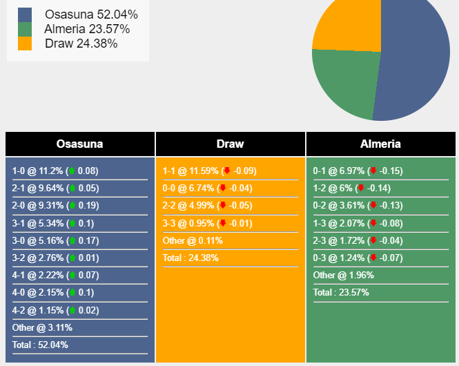 Tỉ số có khả năng xảy ra nhất để Osasuna thắng là 1-0 với xác suất 11,2%. Tỷ số có khả năng xảy ra tiếp theo cho kết quả đó là 2-1 (9,64%) và 2-0 (9,31%). Tỷ số hòa có khả năng xảy ra cao nhất là 1-1 (11,59%), trong khi tỷ số cho Almeria thắng là 0-1 (6,97%).