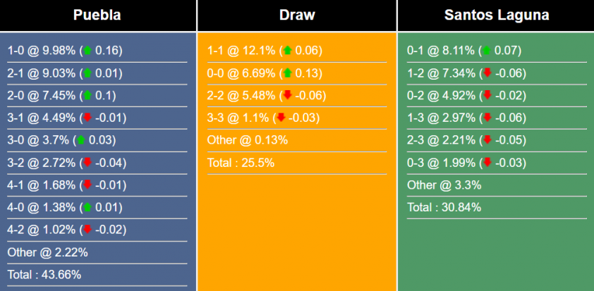 Tỷ số có khả năng nhất cho Puebla thắng là 1-0 với xác suất là 9,98%. Các tỷ số có khả năng xảy ra tiếp theo cho kết quả đó là 2-1 (9,03%) và 2-0 (7,45%). Tỷ số dễ thắng nhất của Santos Laguna là 0-1 (8,11%), trong khi tỷ số hòa là 1-1 (12,1%).