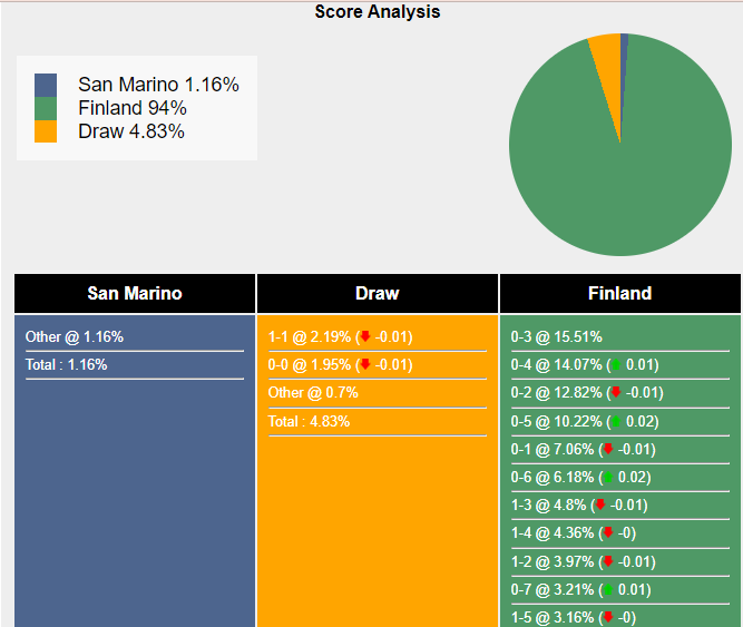 Tỉ số có khả năng xảy ra nhất để Phần Lan thắng là 0-3 với xác suất 15,51%. Tỷ số có khả năng xảy ra tiếp theo cho kết quả đó là 0-4 (14,07%) và 0-2 (12,82%). Tỷ số hòa có khả năng xảy ra cao nhất là 1-1 (2,19%), trong khi tỷ số cho trận thắng ở San Marino là 1-0 (0,6%).