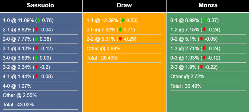 Tỷ số có khả năng nhất cho một trận thắng của Sassuolo là 1-0 với xác suất là 11,09%. Các tỷ số có khả năng xảy ra tiếp theo cho kết quả đó là 2-1 (8,82%) và 2-0 (7,77%). Khả năng thắng của Monza cao nhất là 0-1 (8,99%), trong khi tỷ số hòa là 1-1 (12,59%).