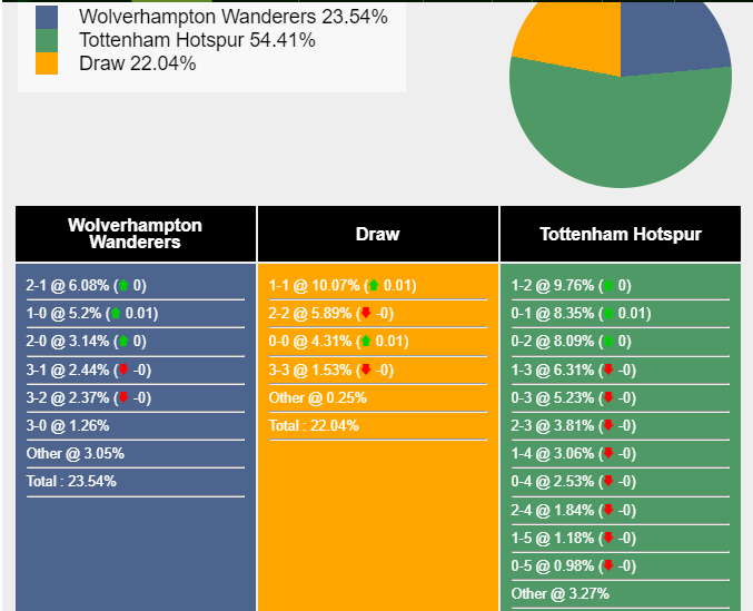 Tỉ số có khả năng xảy ra nhất để Tottenham Hotspur giành chiến thắng là 1-2 với xác suất 9,76%. Tỷ số có khả năng xảy ra tiếp theo cho kết quả đó là 0-1 (8,35%) và 0-2 (8,09%). Tỷ số có khả năng cao nhất giúp Wolverhampton Wanderers giành chiến thắng là 2-1 (6,08%), trong khi tỷ số hòa là 1-1 (10,07%).