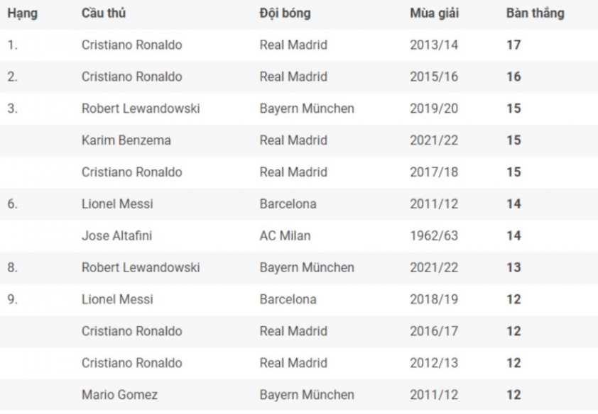 Ở mùa giải 2013/14, Ronaldo trong màu áo Real Madrid, đã ghi 17 bàn sau 11 trận và giúp Los Blancos vô địch Champions League. Đến nay, vẫn chưa có cầu thủ nào cân bằng được thành tích của CR7.