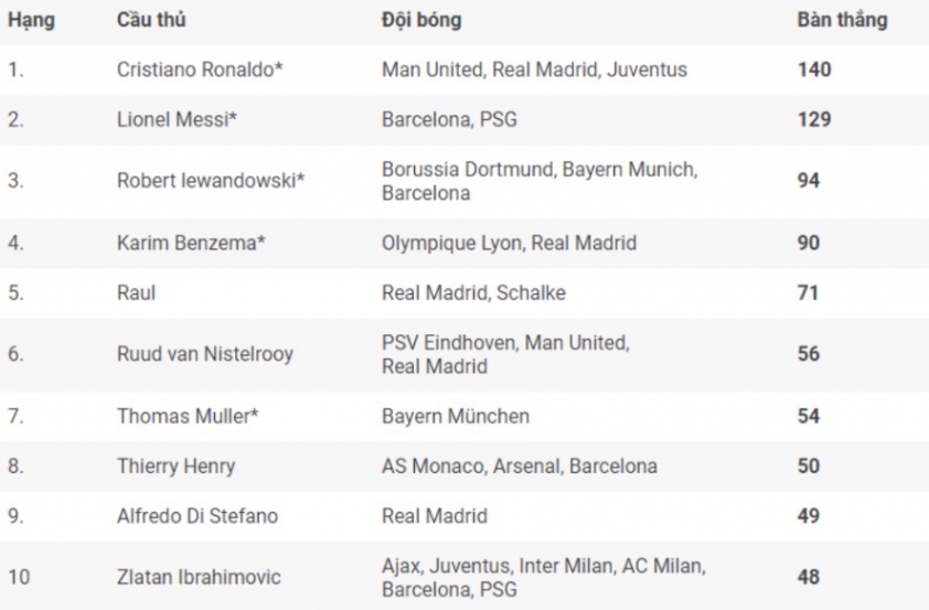 Với phong độ hủy diệt suốt nhiều mùa giải, không có gì ngạc nhiên khi Cristiano Ronaldo và Lionel Messi tiếp tục đứng đầu danh sách ghi bàn mọi thời đại ở Champions League. Trong đó, Ronaldo dẫn đầu với 140 bàn thắng. Khoảng cách giữa Ronaldo và Messi so với những người xếp sau là rất lớn.