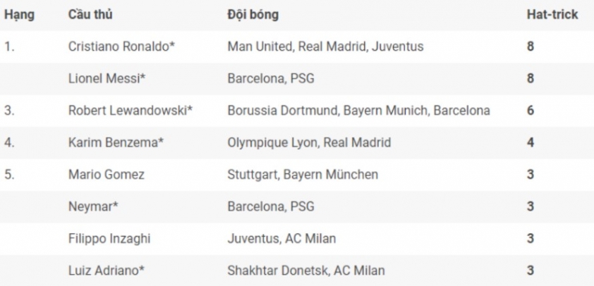 Cristiano Ronaldo và Lionel Messi đang chia sẻ vị trí dẫn đầu với 8 lần. Trừ Robert Lewandowski, số lần lập hattick của Ronaldo và Messi nhiều gấp đôi những người còn lại.