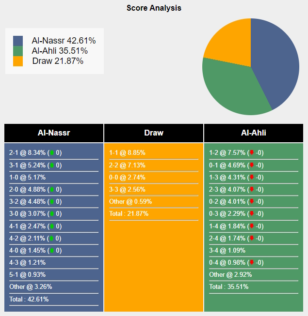 Tỷ số khả dĩ nhất cho chiến thắng của Al-Nassr là 2-1 với xác suất là 8,34%. Tỷ số khả dĩ thứ hai cho kết quả đó là 3-1 (5,24%) và 1-0 (5,17%). Chiến thắng khả dĩ nhất của Al-Ahli là 1-2 (7,57%), trong khi tỷ số hòa là 1-1 (8,85%).